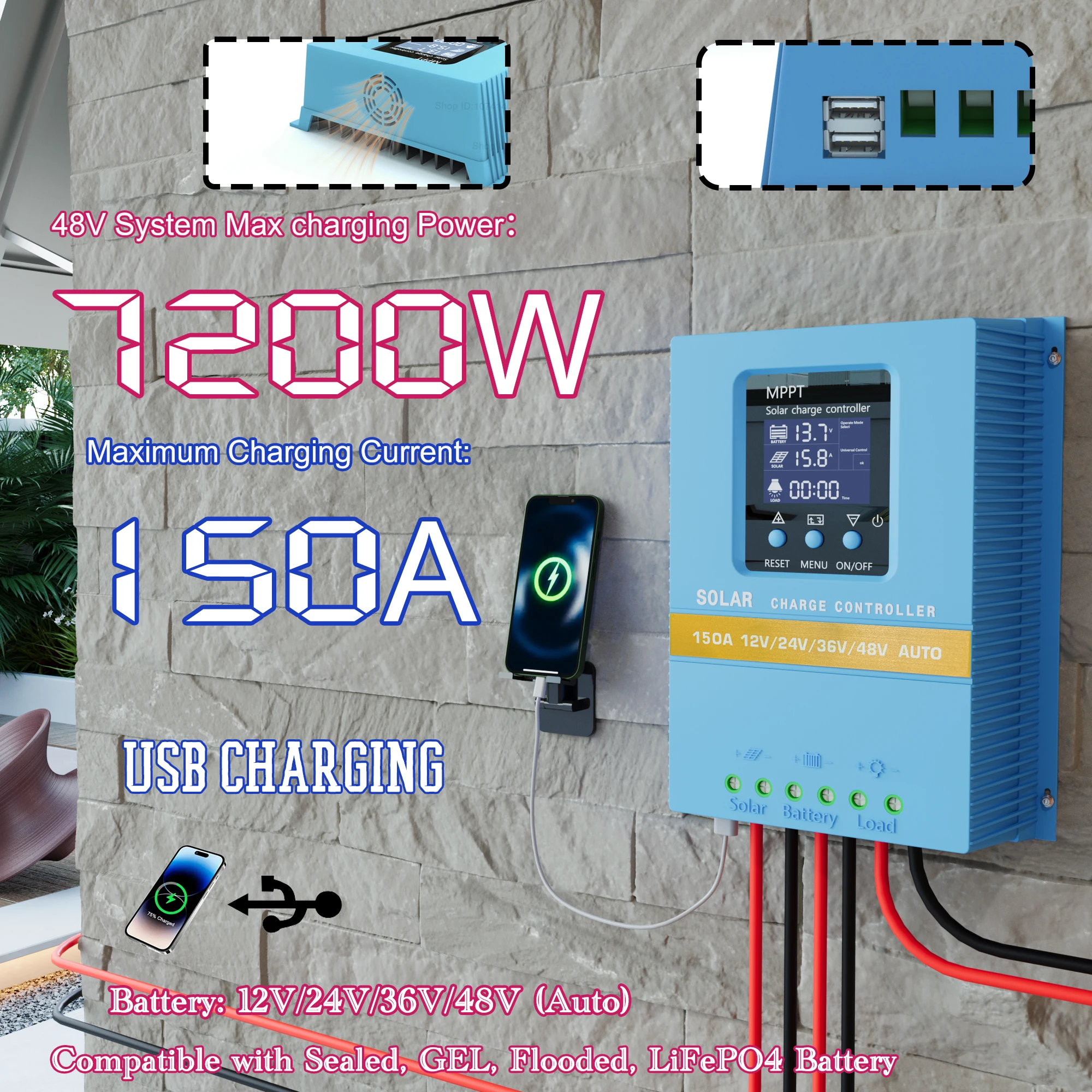 150A Max 7200W 120A 100A 60A Solar Charge Controller MPPT Smart cooling -fan, 12V/24V/36V/48V Auto Dual USB, 7 Modes LCD Display