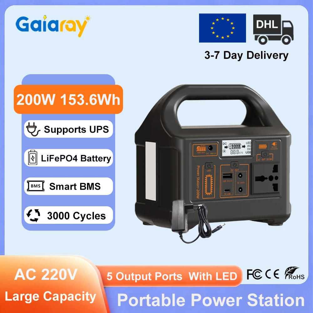 Gaiaray 200W Portable Power Station 153.6Wh LiFePO4 Battery Solar Generator AC 220V UPS Power Bank for Home Backup Power Camping