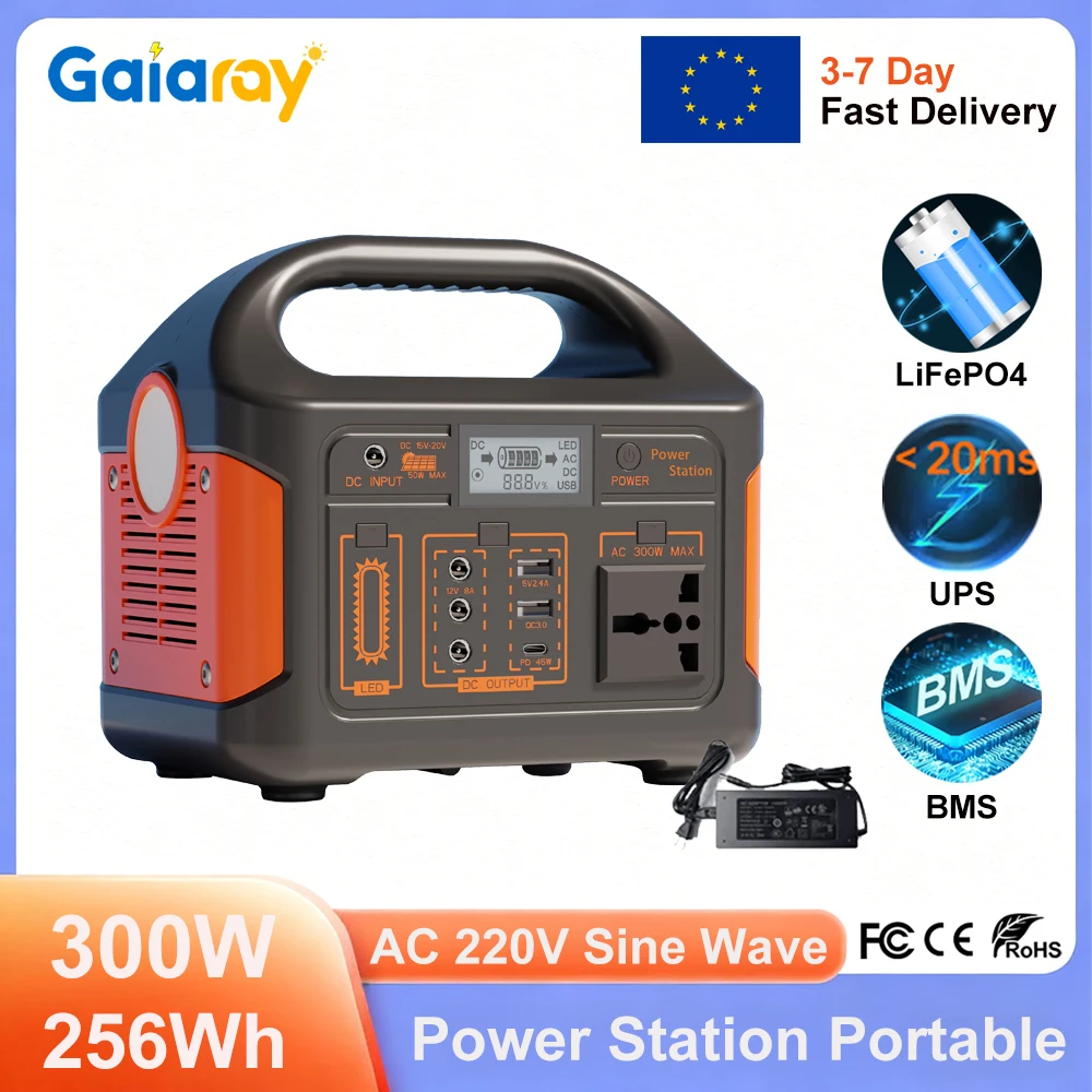 Gaiaray 300W 256Wh Portable Power Station UPS Solar Generator LiFePO4 Battery Power Plant Sine Wave Charging Station for Camping